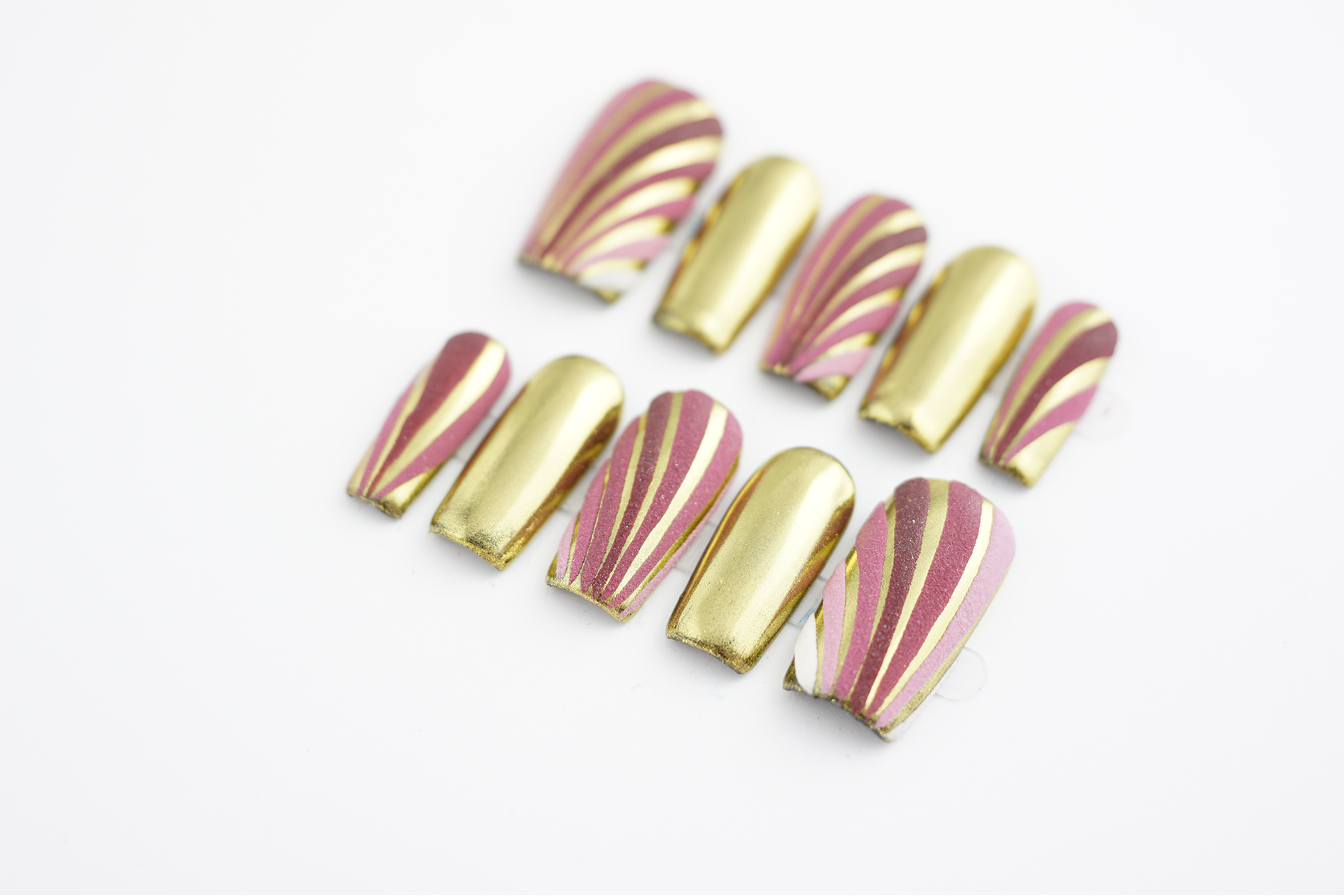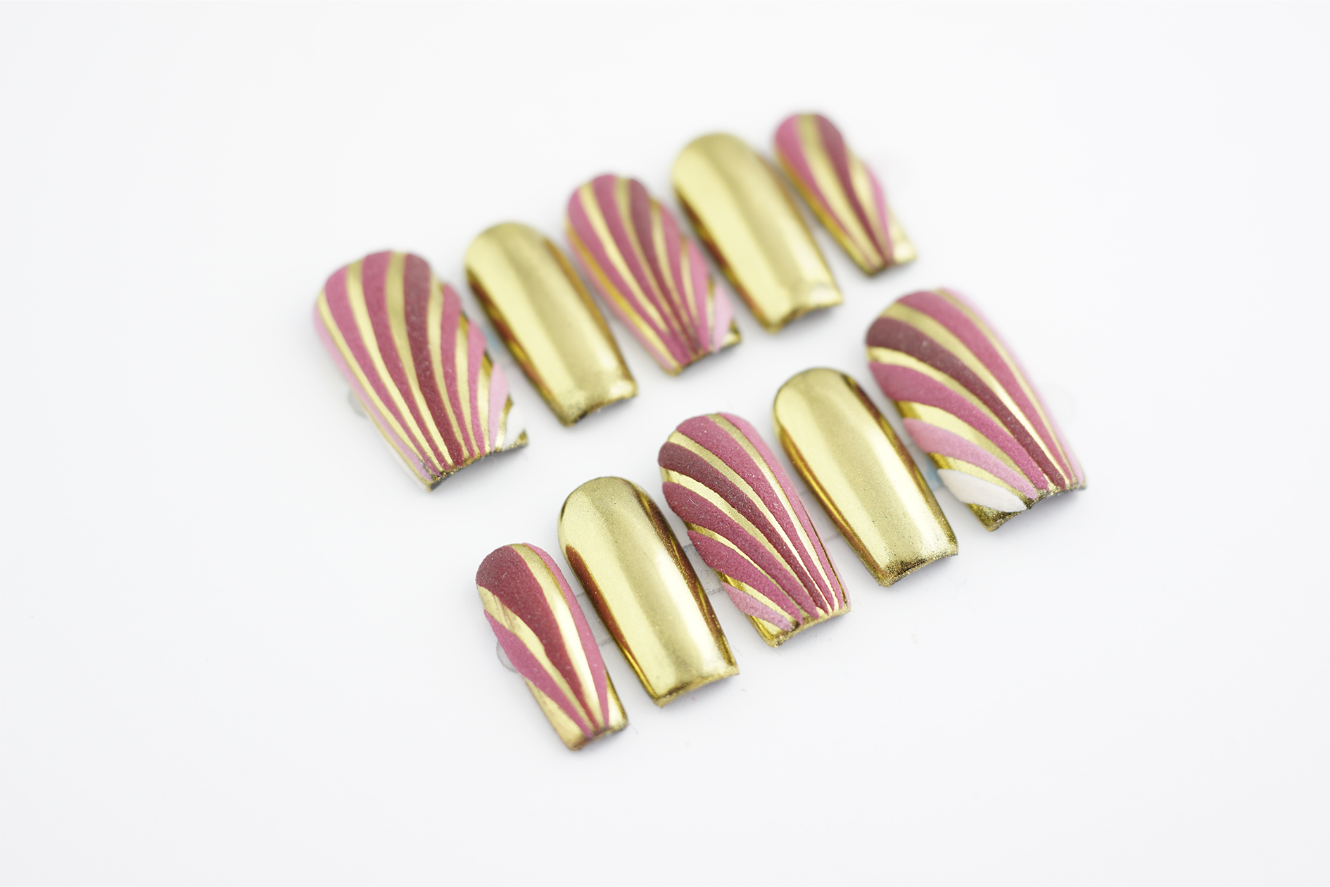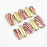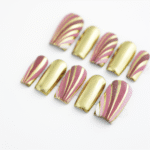 Merülj el a Golden Petal varázslatos világában, ahol az arany fény találkozik a finom rózsaszínnel 💖✨. Ez a szett a luxus, a nőiesség és a kreatív elegancia tökéletes harmóniáját hozza el neked. A körmök hullámos, lágy vonalai olyanok, mint a napfényben csillogó virágszirmok 🌸💛 — különlegesek, izgalmasak és minden mozdulatoddal feltűnően szépek.
