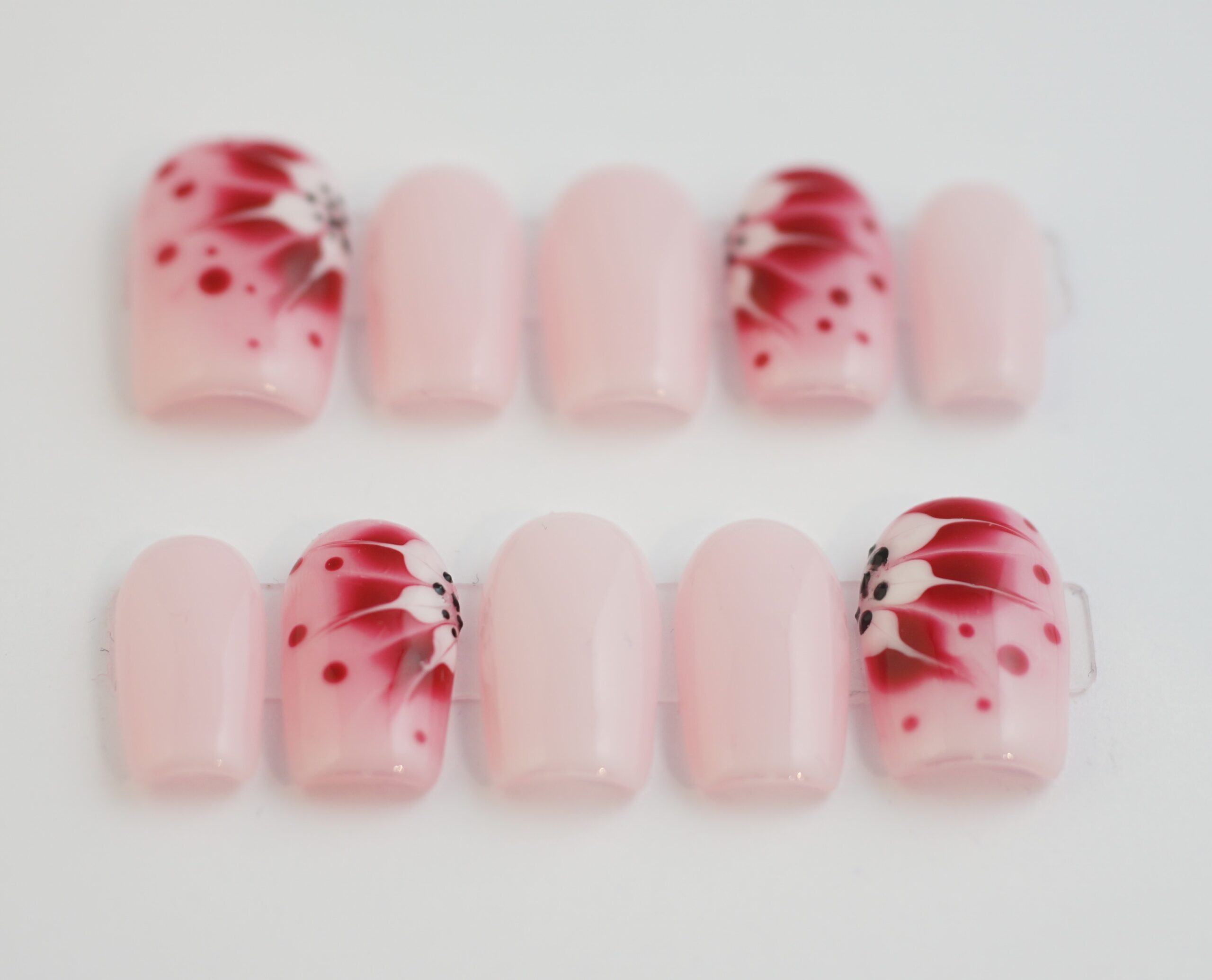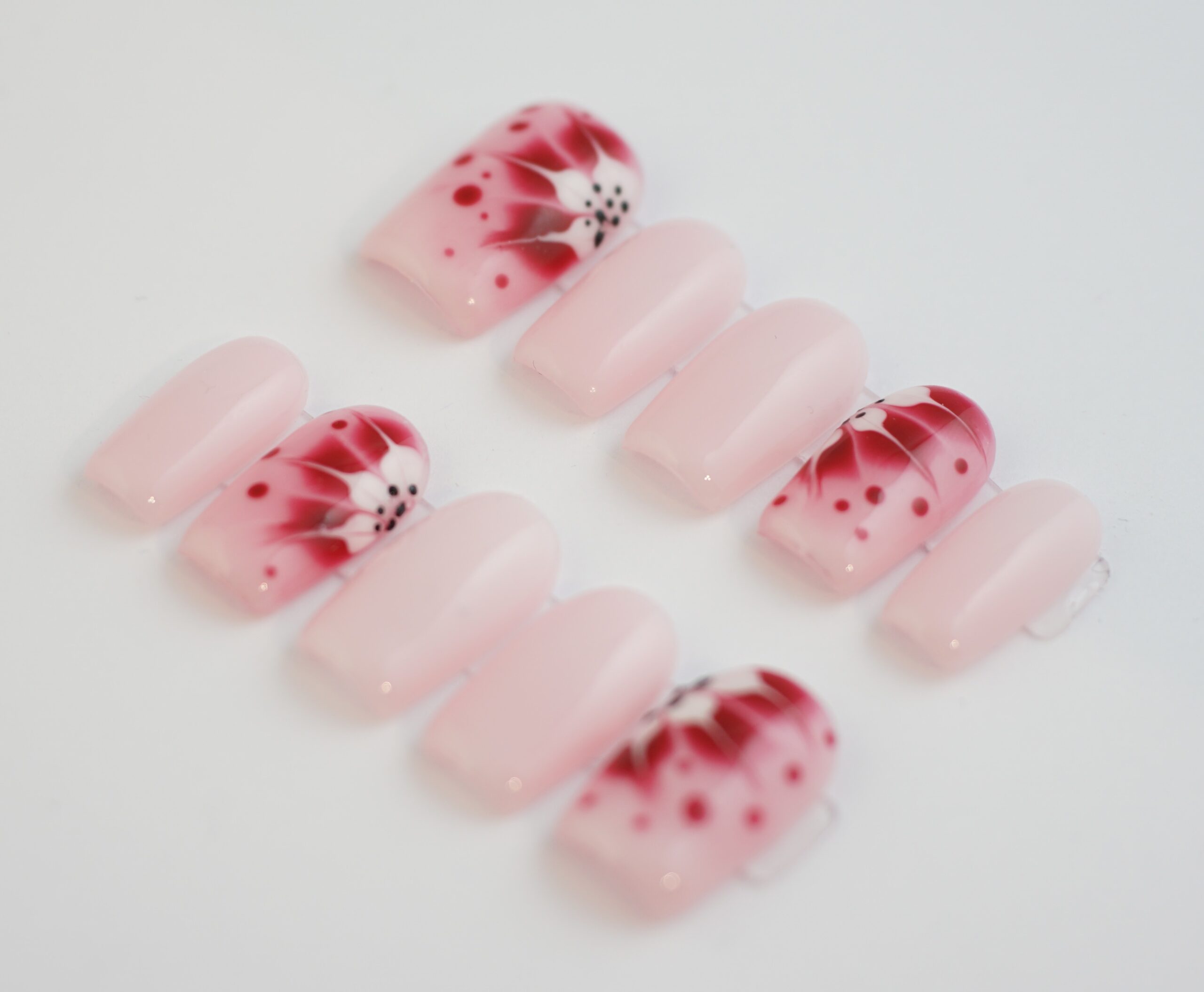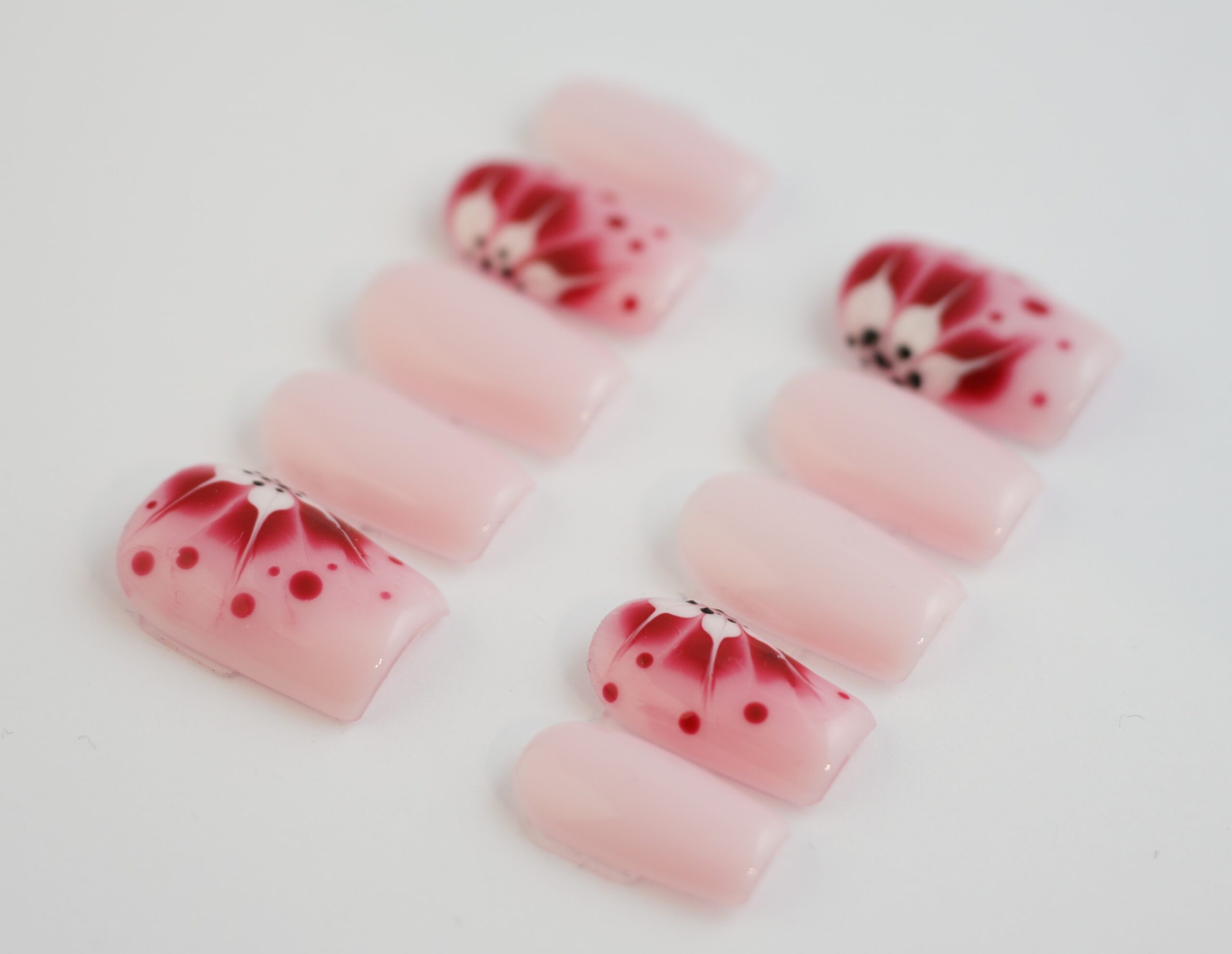 Ez az egyedi Press On szett a természet finomságát és a piros szín szenvedélyét ötvözi precíz, kézzel festett virág mintával. A finom pöttyözés és a sziromminták mélységet adnak a dizájnnak, így ez a szett nemcsak egy kiegészítő, hanem egy igazi ékszer a kezeden.
