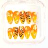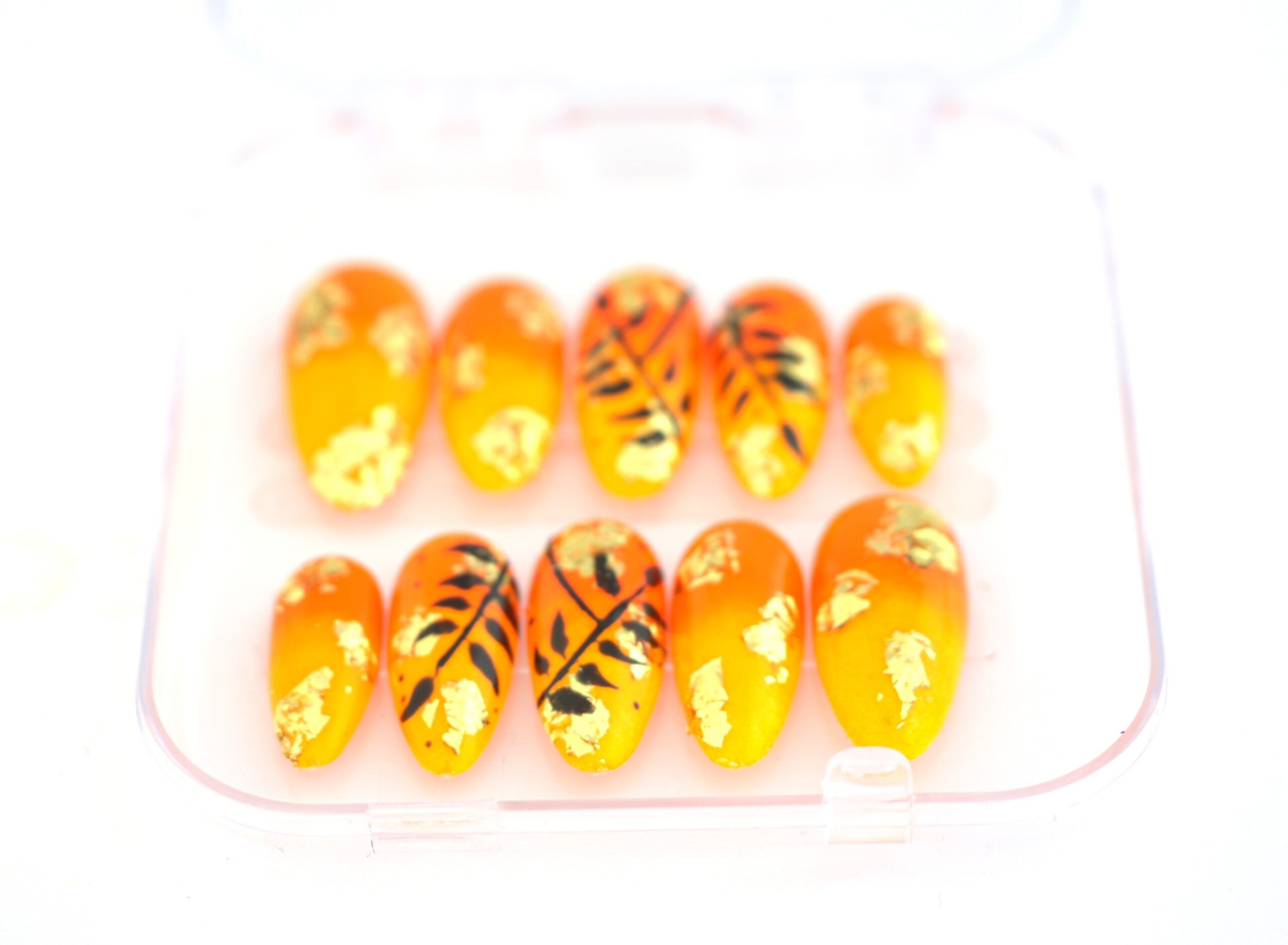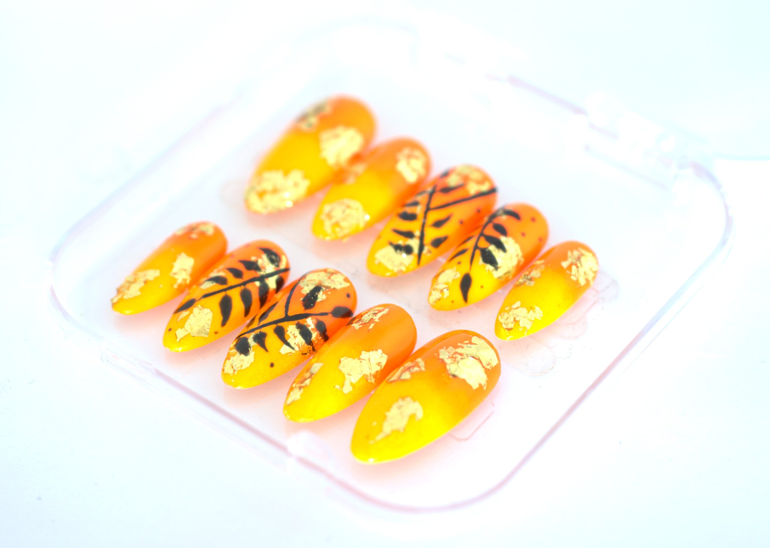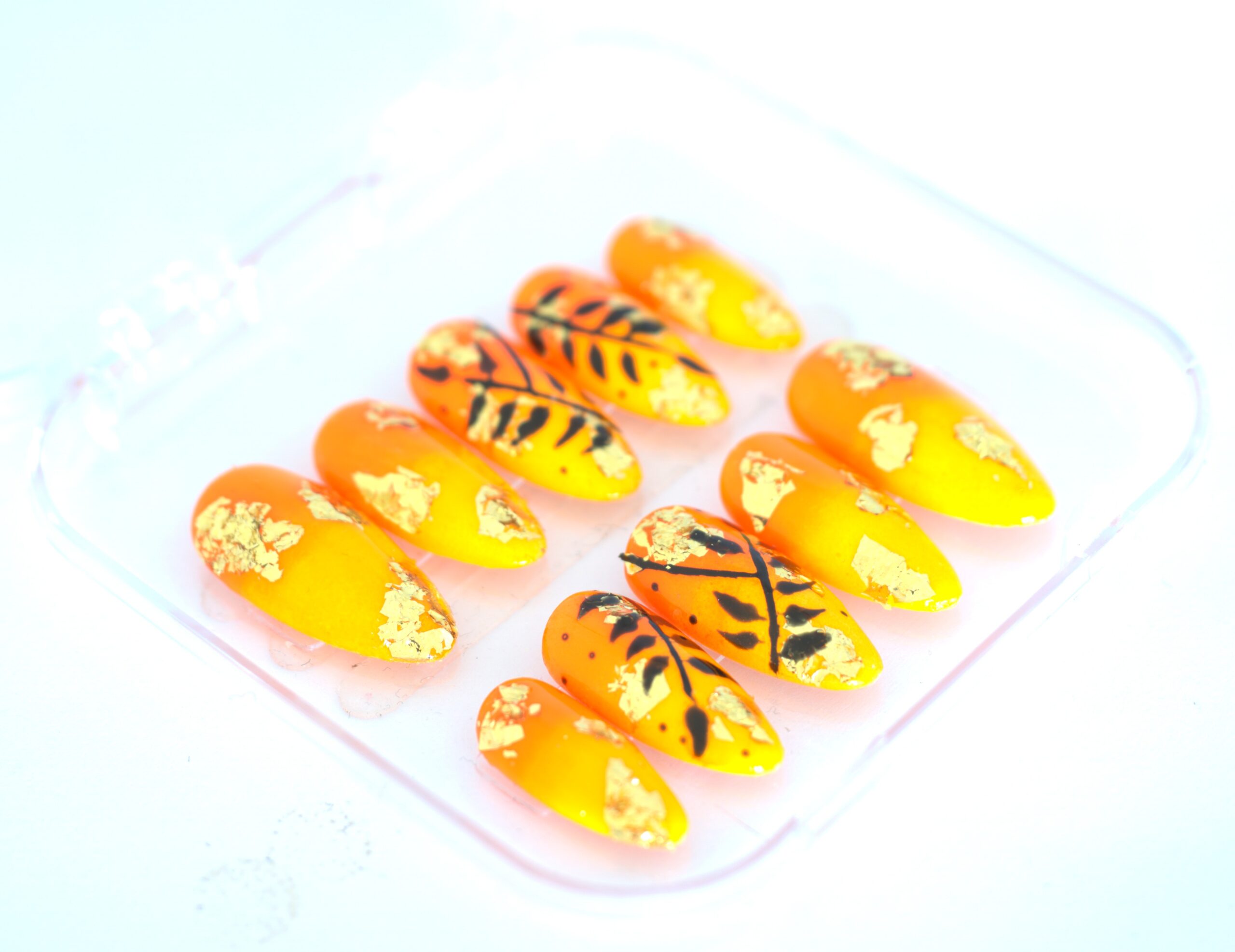 Varázsold különlegessé a megjelenésed ezzel az egyedi, kézzel készült Press On szettel. A szett alapját egy lágy, mégis intenzív narancssárga ombre átmenet adja, amelyet aprólékos, fekete színű növényi motívumok tesznek művészivé. Az arany füstfólia darabkák extra csillogást és luxust érzetet kölcsönöznek a körmöknek. Minden egyes darabja kézzel díszített igy nincs két tökéletesen egyforma minta. 🔥🔥
