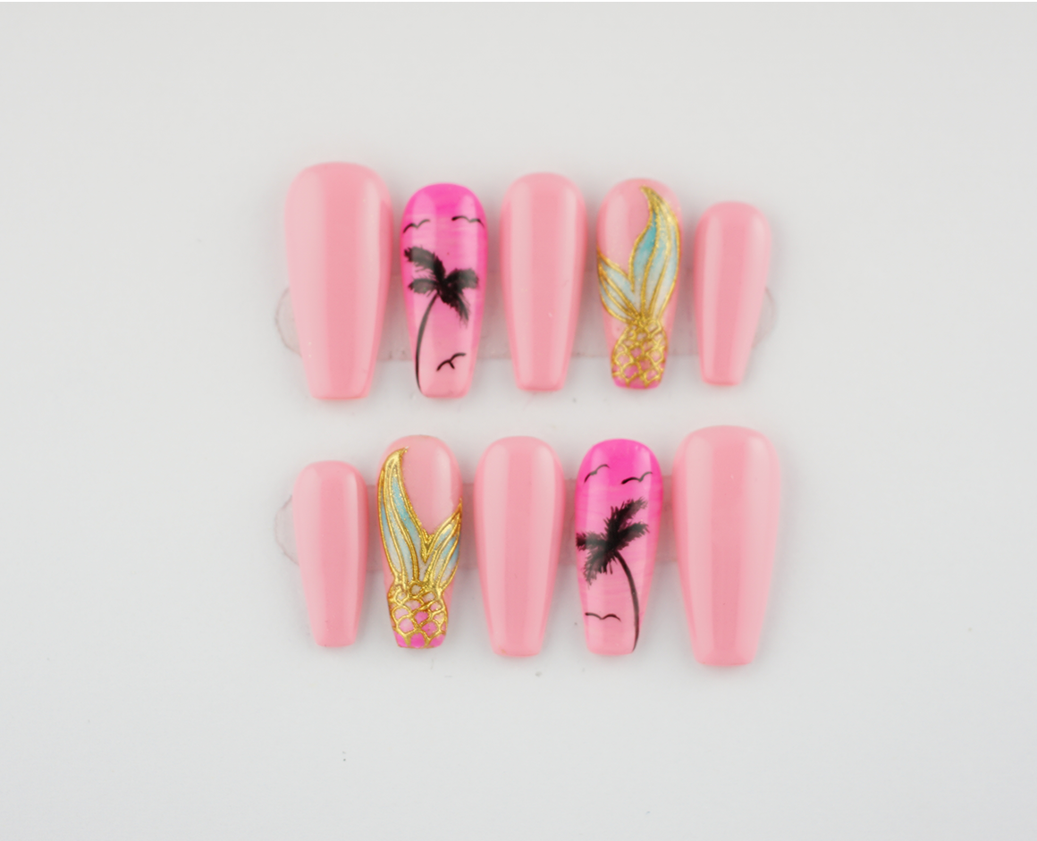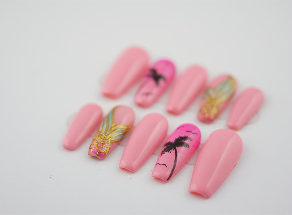 Engedd, hogy a körmeid elrepítsenek egy varázslatos tengerparti világba! A „Mermaid Paradise” szett a sellők titokzatos szépségét és a trópusi pálmafák lazaságát ötvözi egyedülálló dizájnban. A színes sellőfarok motívumok gyöngyházfényben ragyognak, míg a finoman megfestett pálmafák a naplementék és vakációk hangulatát idézik.