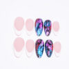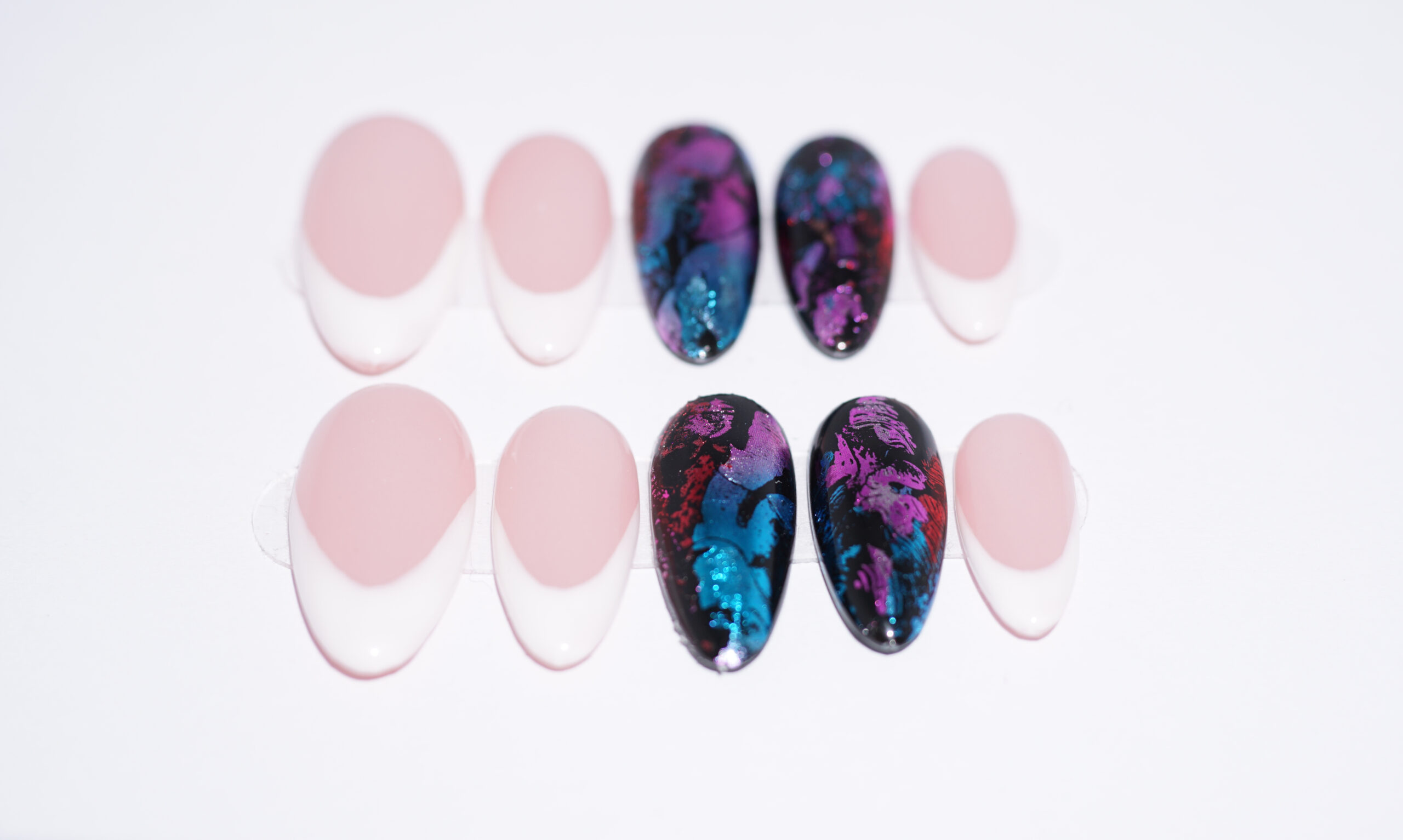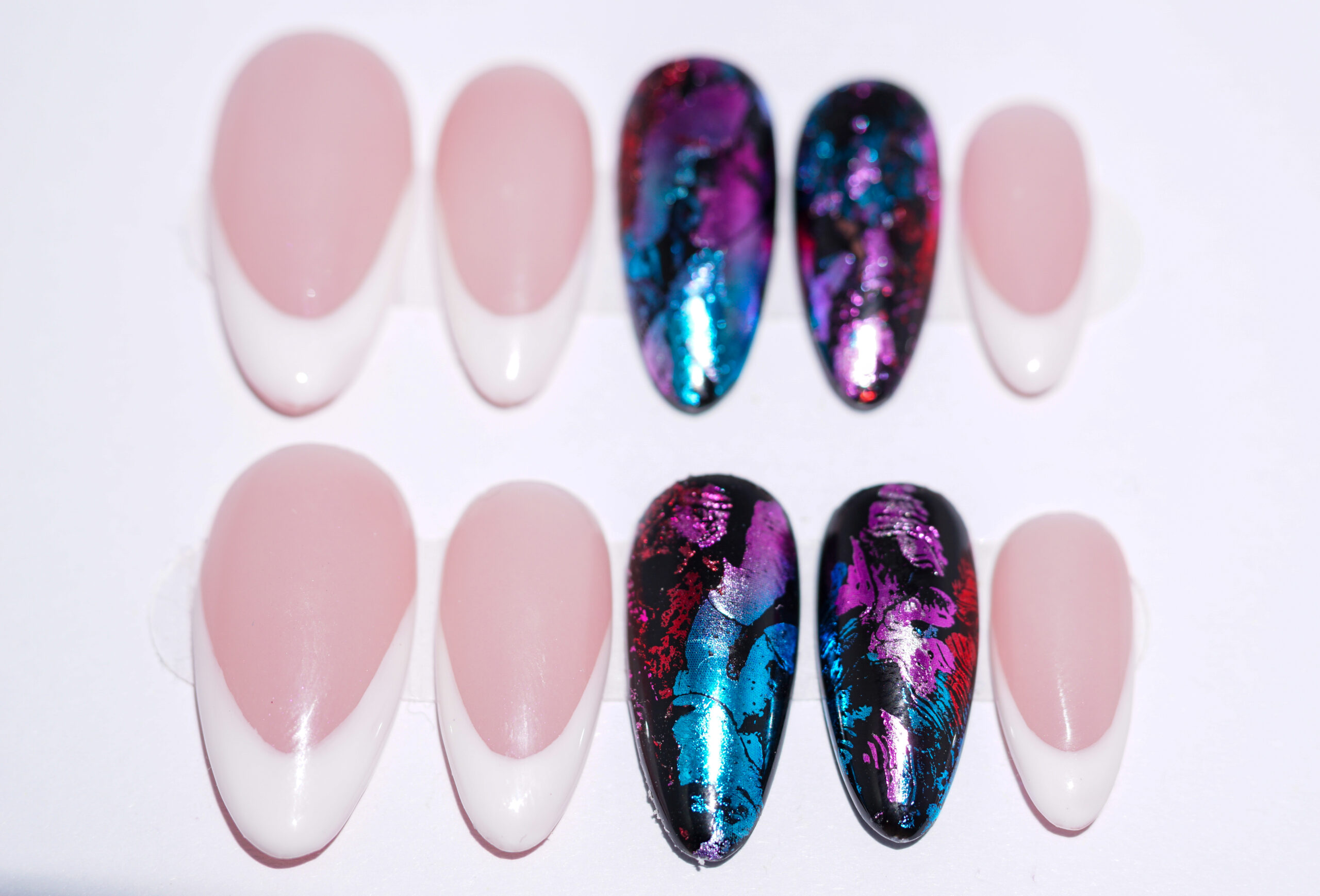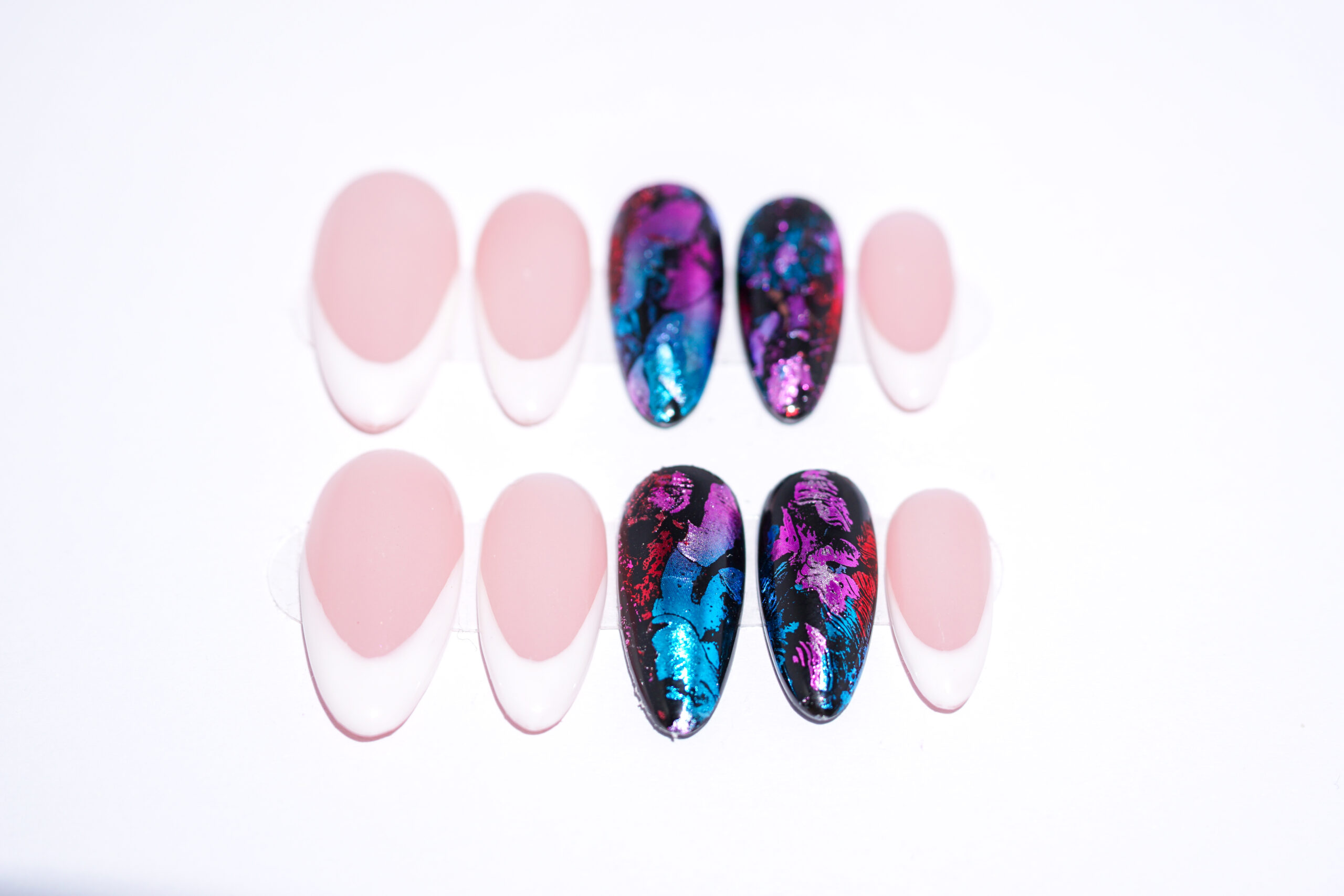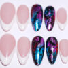 Ez a szett a francia manikűr klasszikus szépségét ötvözi az északi fény színjátékaival – a mély fekete alapon táncoló lila, kék és pink árnyalatok egyszerűen hipnotizálóak. 💜💙✨