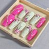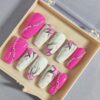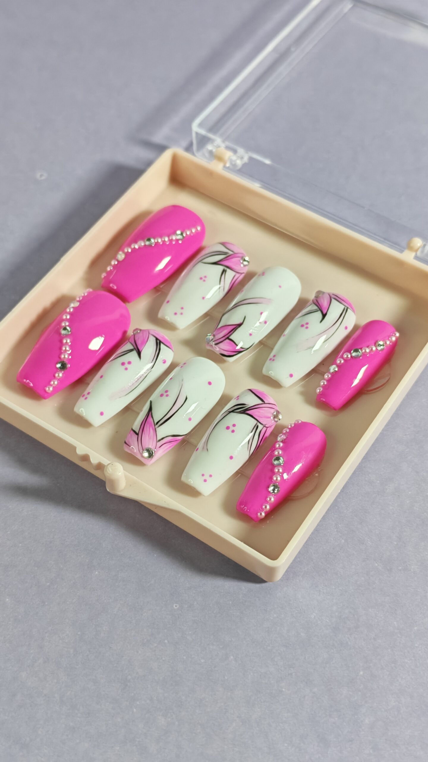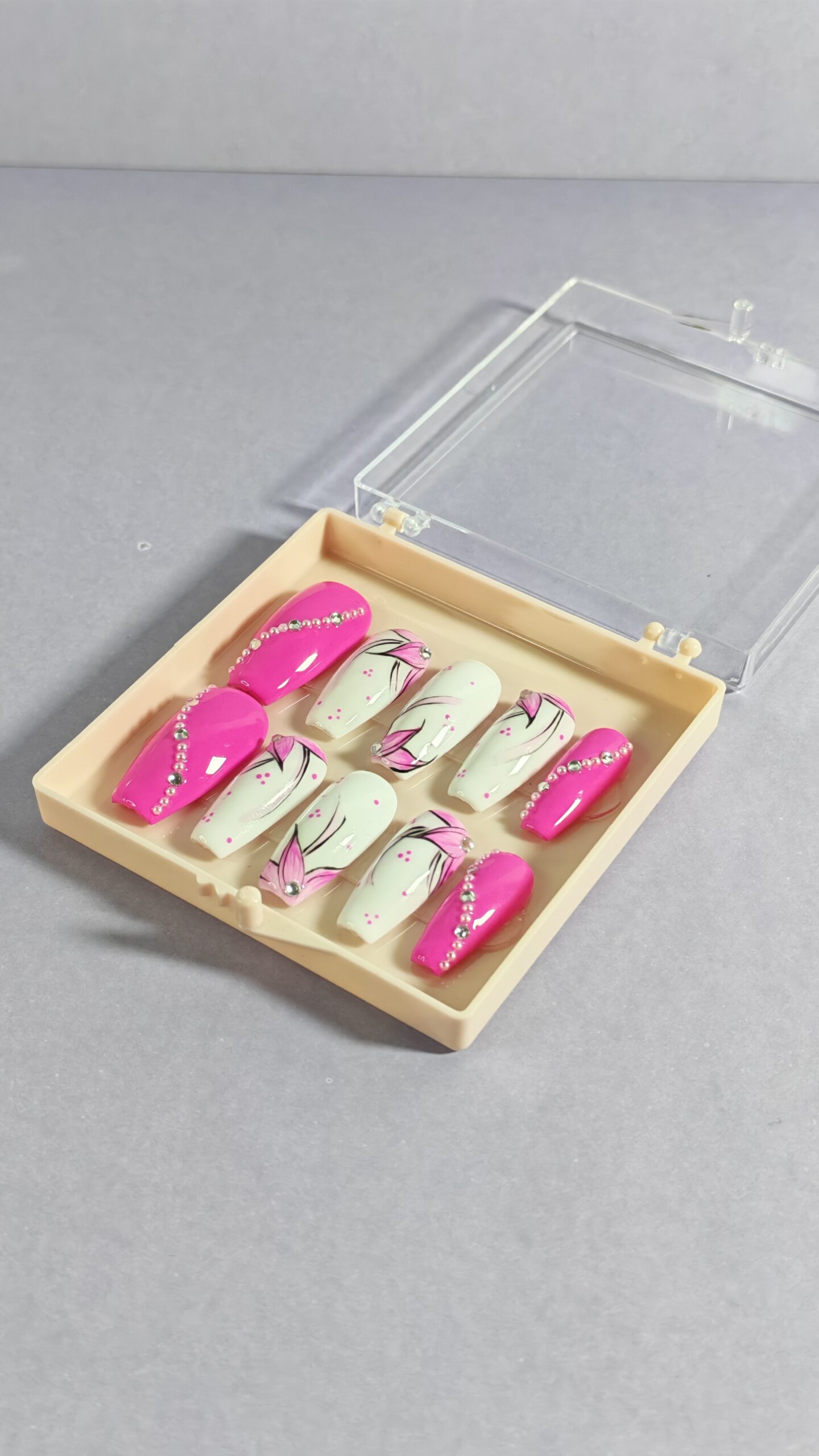 A Blossom Elegance szett minden részletében a nőiességet és a luxust ünnepli. Az élénk pink körmök játékosságát finom kristálydíszek emelik ki, míg a fehér alapra kézzel festett virágminták a természet könnyedségét hozzák el. A pink és a fehér kontrasztja modern, mégis elegáns összhangot teremt.
